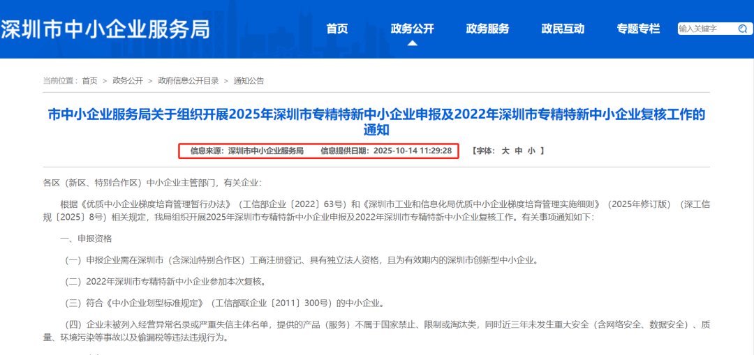 根据《优质中小企业梯度培育管理暂行办法》(工信部企业〔2022〕63号)和《深圳市工业和信息化局优质中小企业梯度培育管理实施细则》(2025年修订版)(深工信规〔2025〕8号)相关规定,我局组织开展2025年深圳市专精特新中小企业申报及2022年深圳市专精特新中小企业复核工作。有关事项通知如下:
