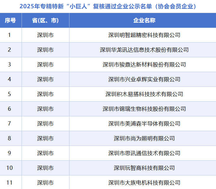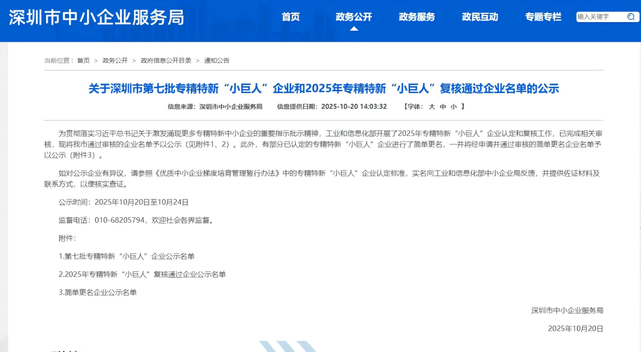 2025年10月20日,深圳市中小企业服务局发布了关于深圳市第七批专精特新 “小巨人” 企业和2025年专精特新 “小巨人” 复核通过企业名单的公示。