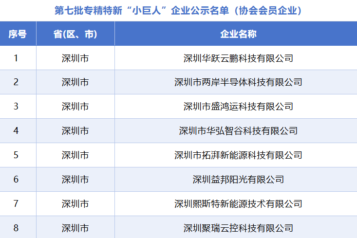 根据公示名单,深圳华跃云鹏科技有限公司、深圳市两岸半导体科技有限公司等8家企业入选第七批专精特新 “小巨人” 企业公示名单。同时,深圳明智超精密科技有限公司、深圳华龙讯达信息技术股份有限公司等11家企业通过2025年专精特新 “小巨人” 复核。